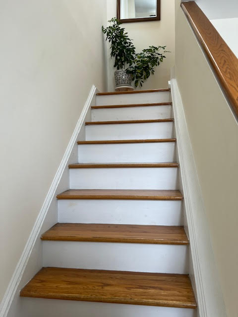 Enter into the first level living room dining room area, high ceiling and bright. Follow the stairs to the large bedroom with closet space and a full bathroom.